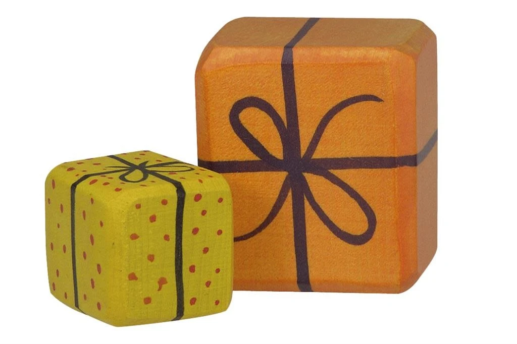 Houten figuren – kerstmis: 2 geschenkjes is een houten speelfiguur van het merk Holztiger. Bestaat uit 2 houten cadeautjes, als 1. Formaat: 8x3x5cm.